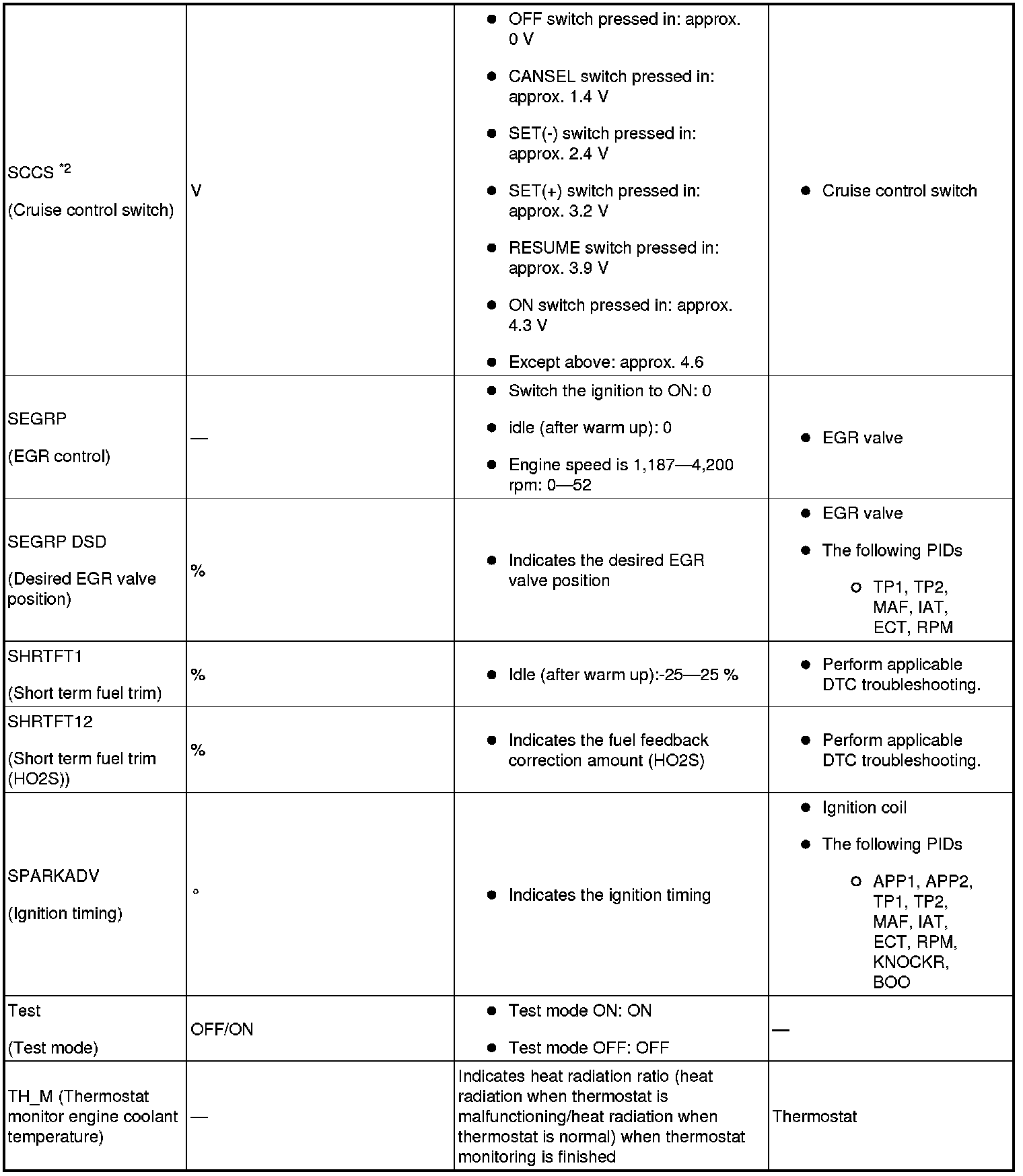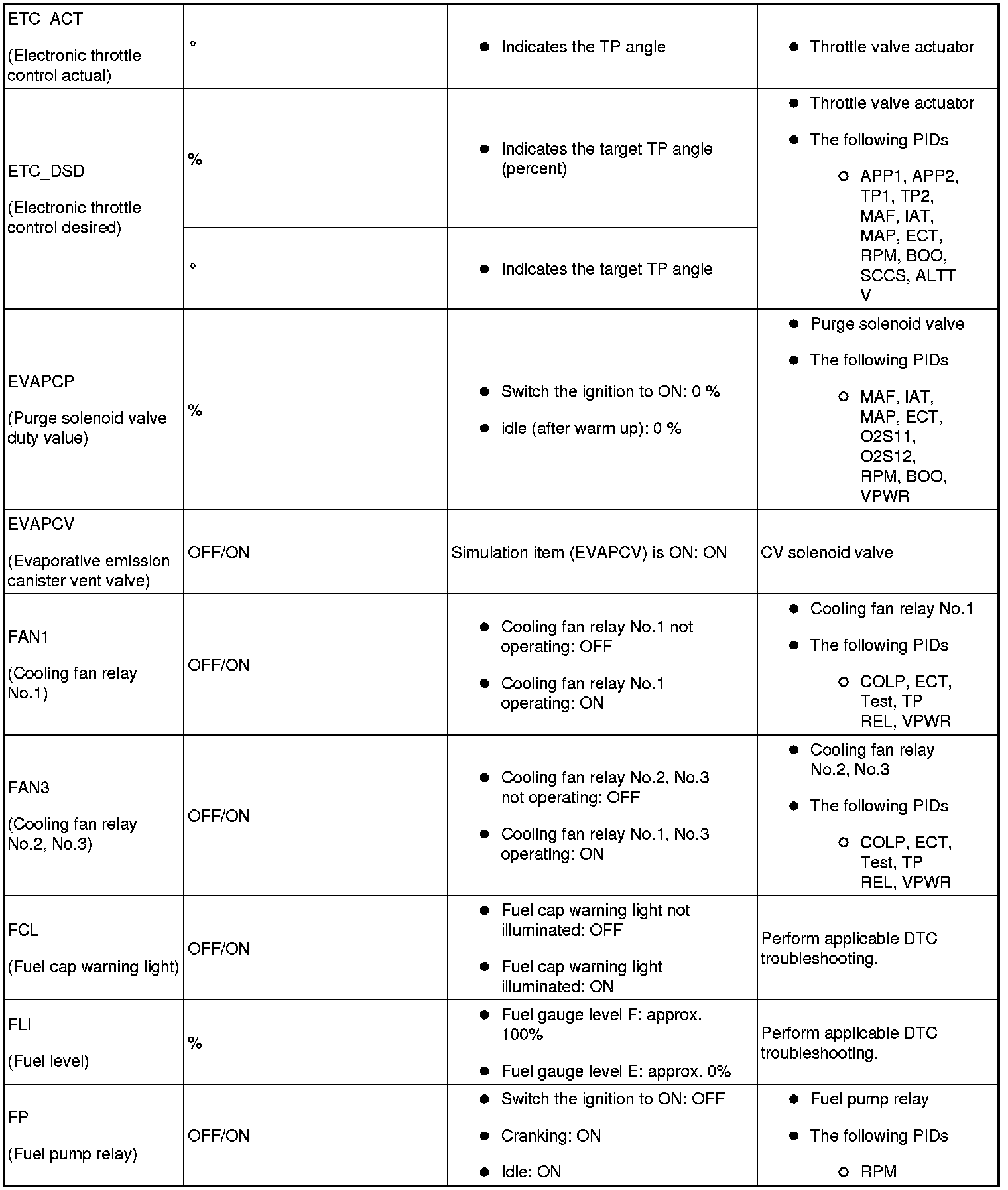 - ACCS, ALTF, ARPMDES, EVAPCP, EVAPCV, FAN1, FAN3, FP, IMRC, IMTV, INJ_1~4, SEGRP, Test, VT Duty1 wt