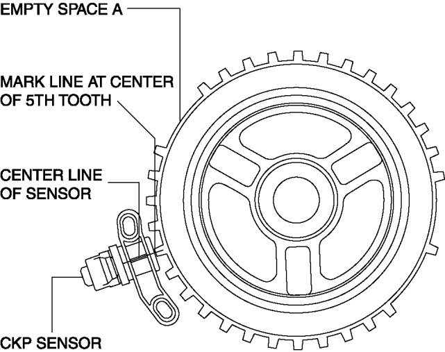 2. Fit the center of the CKP sensor with the fifth tooth (counting counterclockwise from the empty space A as shown in the figure) of the pulse wheel.