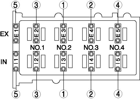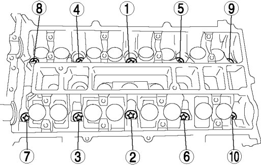 Install the camshaft cap to the position of the marked number shown in the figure, tighten the camshaft cap bolts evenly in 2-3 rounds, and then tighten them in two steps in the order shown in the figure.