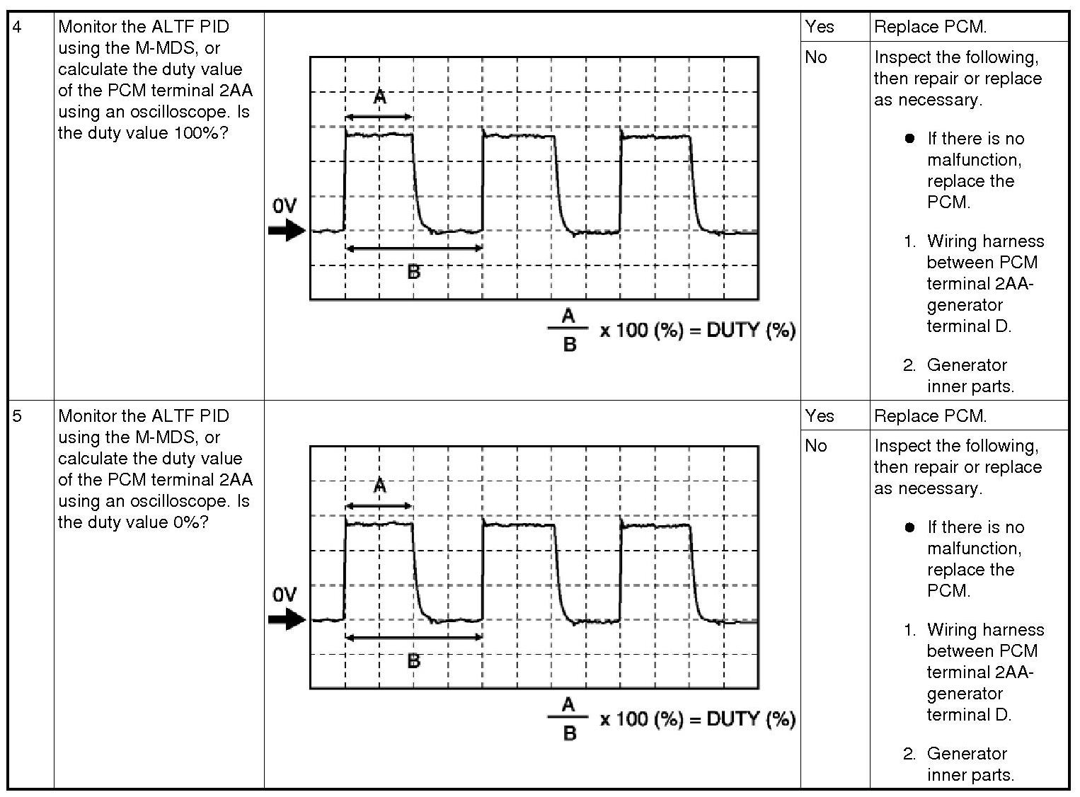 If the generator field coil duty value does not change when electrical loads (such as headlights, blower motor, rear window defroster, brake lights) are on or off, inspection with discharged battery is needed.