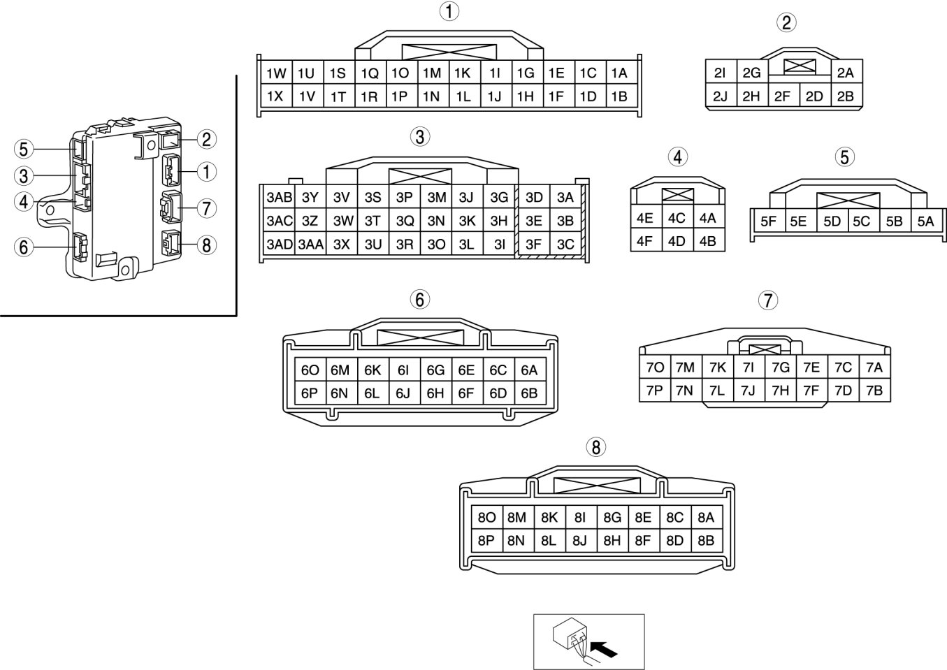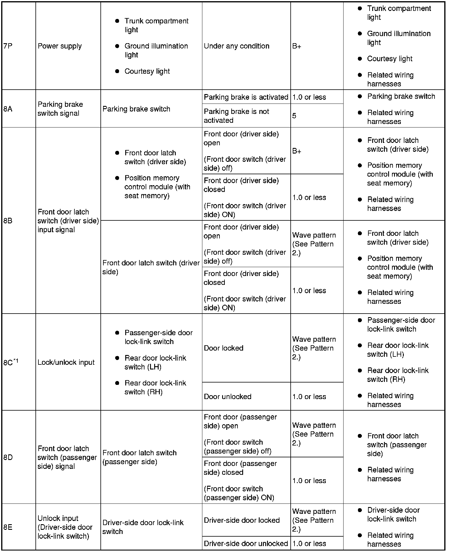 - Front door latch switch (driver side) input signal: 8B (+) -> body ground (-)