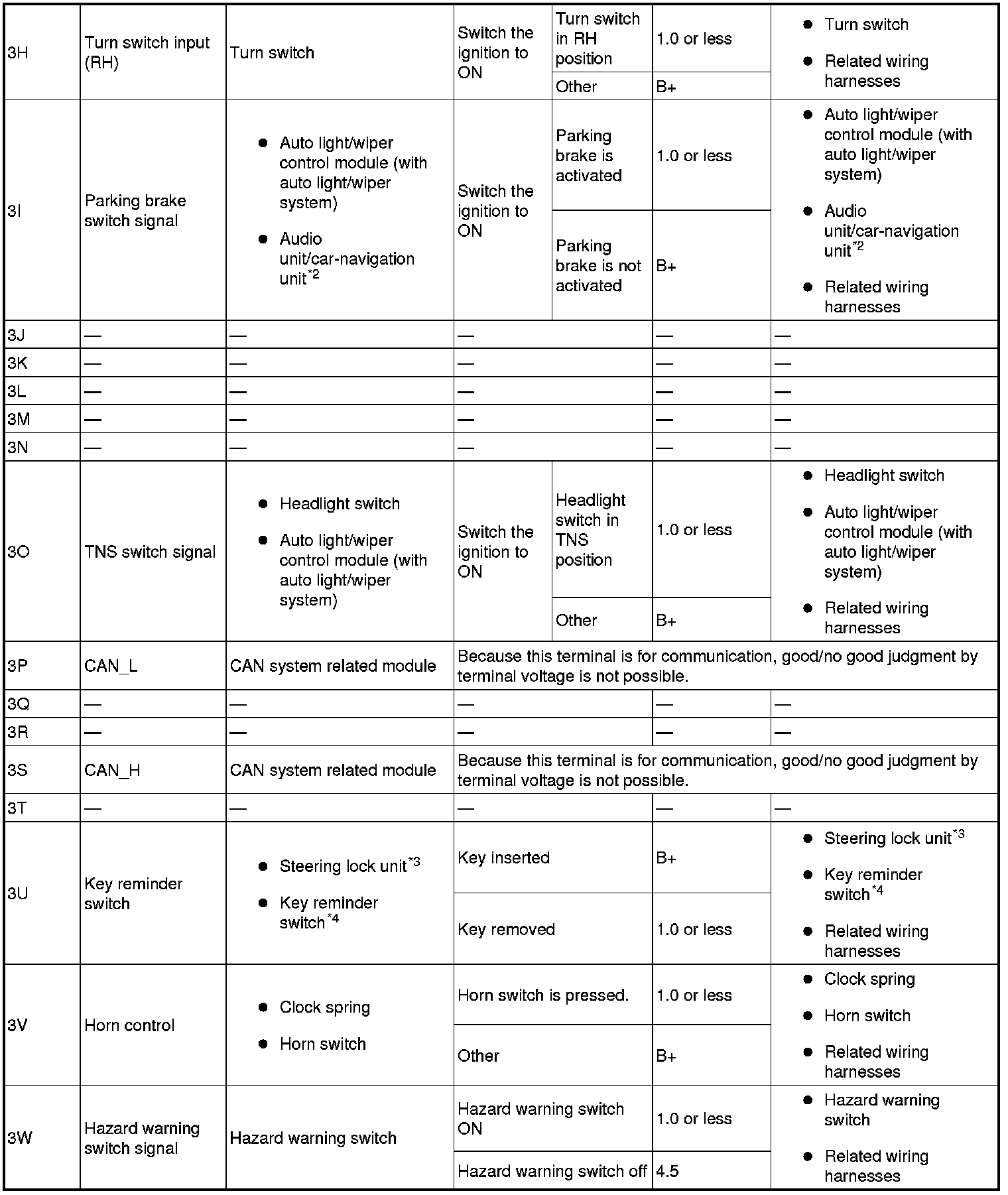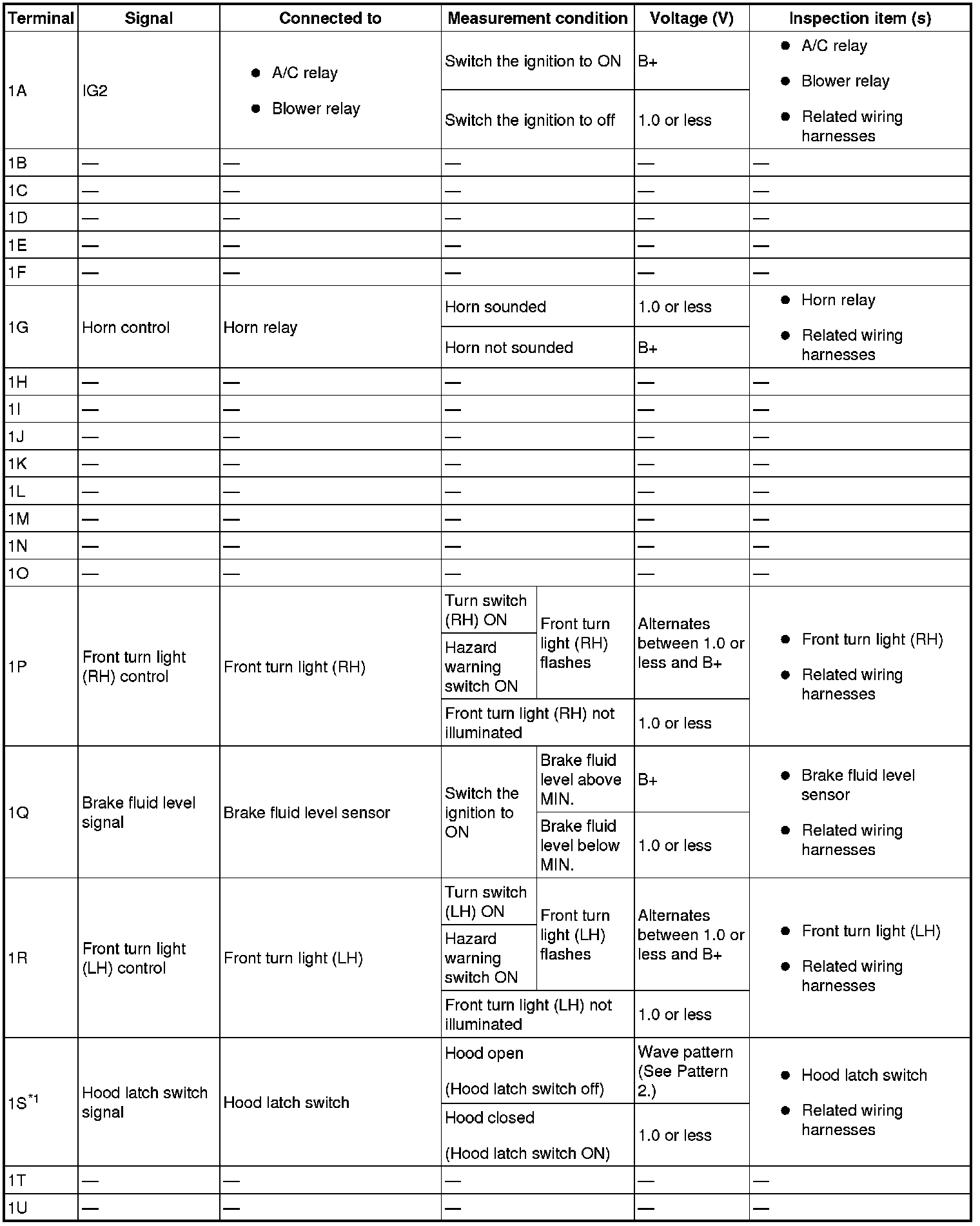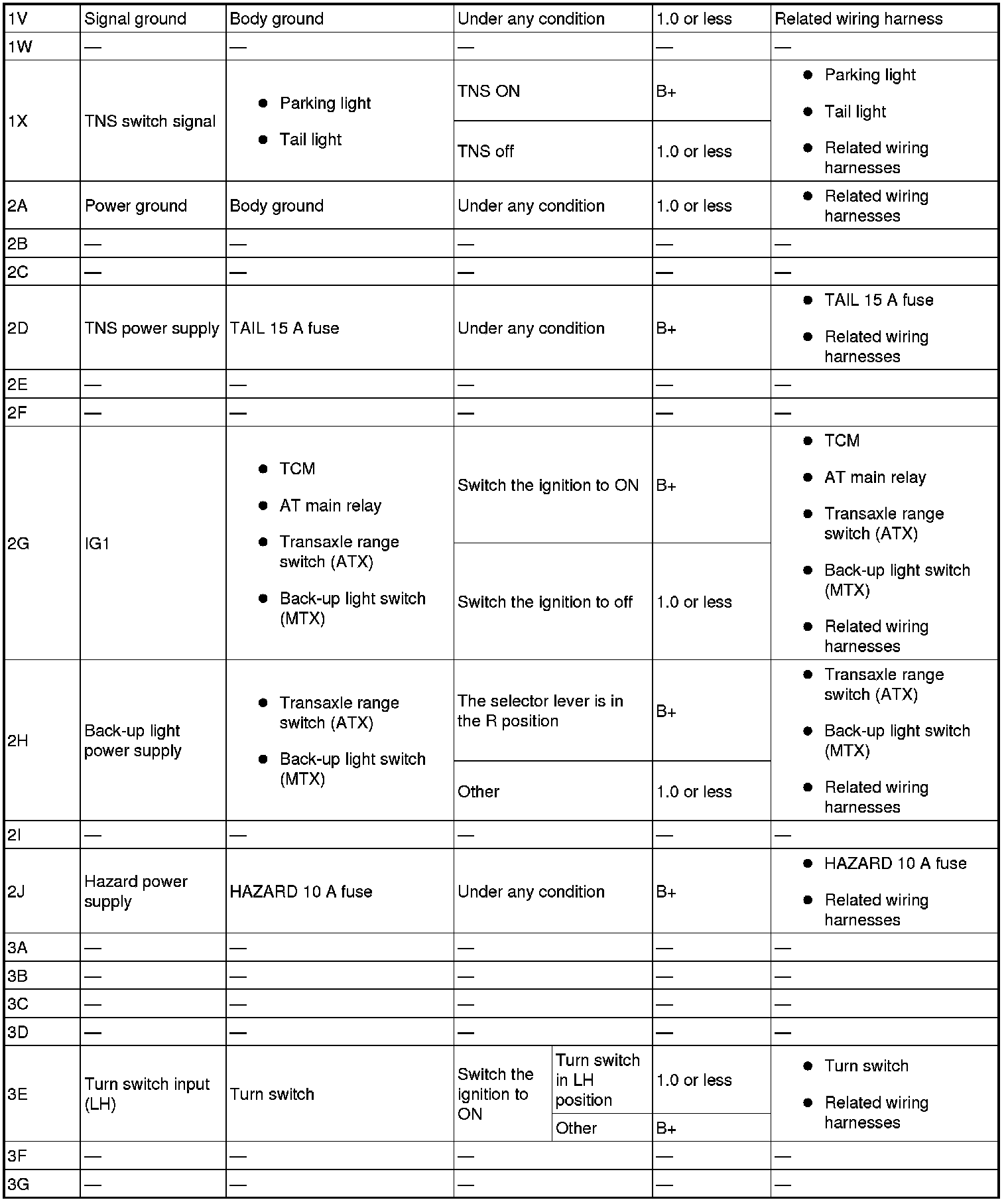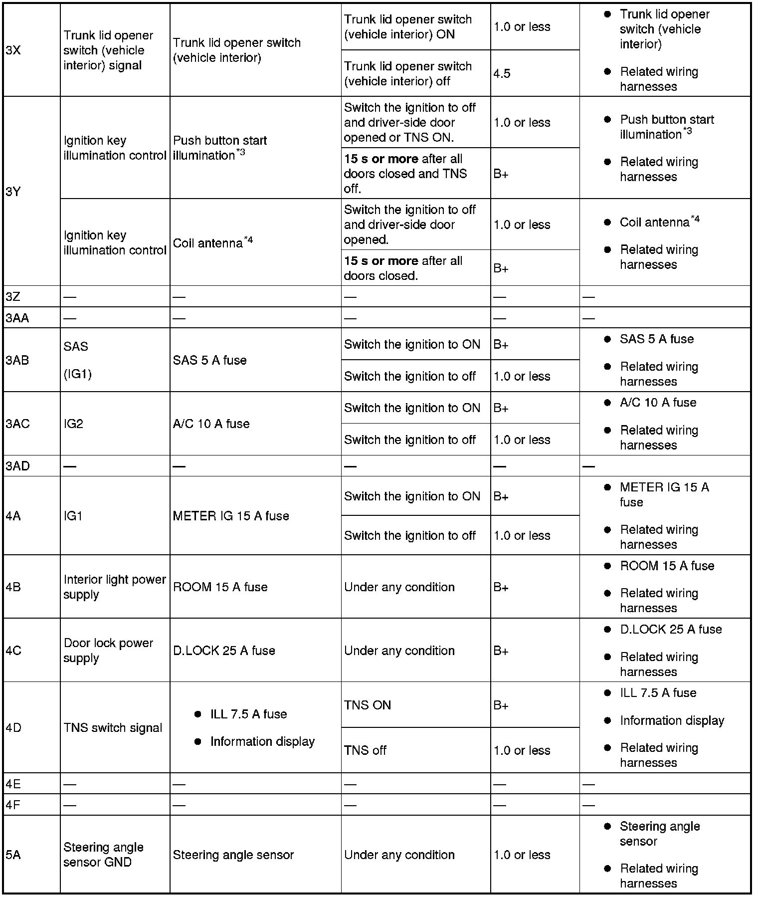 - If the voltage is not as specified in the Terminal Voltage Table, inspect the parts under "Inspection item (s)".