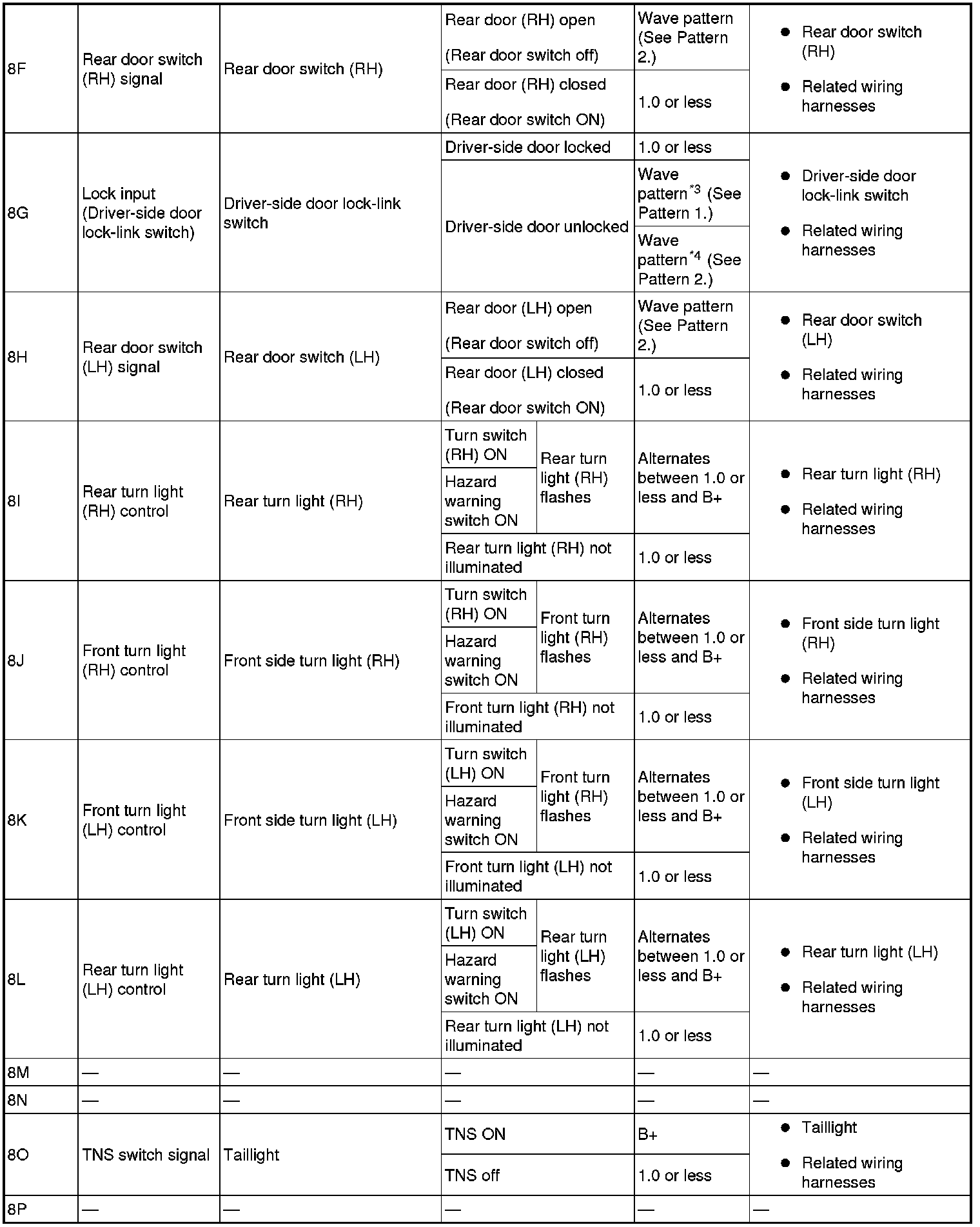 - Rear door switch (RH) signal: 8F (+) -> body ground (-)