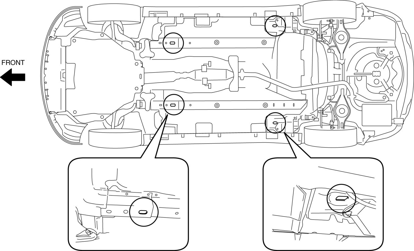 - When transporting the vehicle by flat bed tow truck or trailer, secure the vehicle to the trailer using the holes and left tiedown loop shown in the figure.
