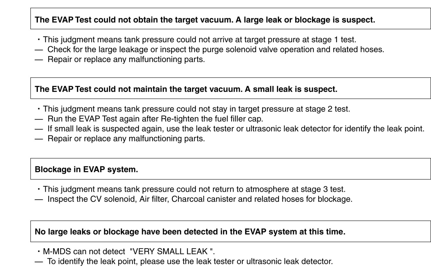 - M-MDS detect the small/large leak or blockage based on fuel tank pressure at the end of EVAP Test.