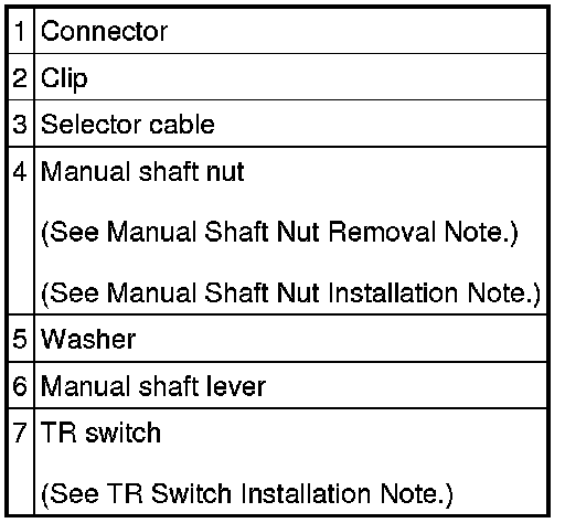 - Do not apply torque to the manual shaft as bending or breakage of the spring pin installed to the manual shaft could damage the TR switch and cause a selector lever malfunction.