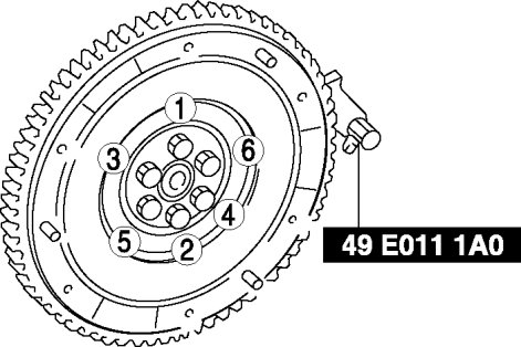 FlywheelTemporarily tighten the lock bolts uniformly in the order of the numbers shown in the figure and install the flywheel.