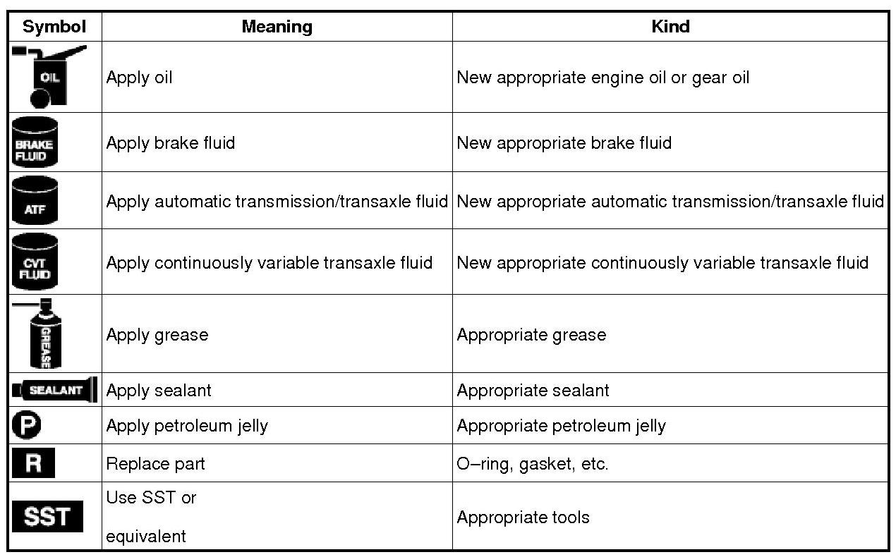 - There are eight symbols indicating oil, grease, fluids, sealant, and the use of SST or equivalent. These symbols show application points or use of these materials during service.