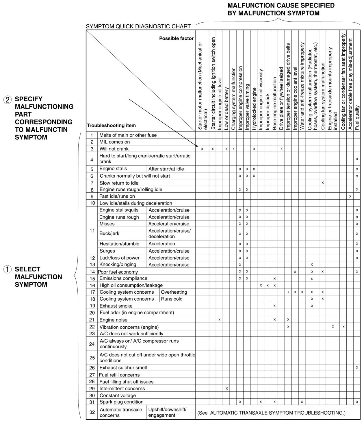- The appropriate diagnostic inspection relating to a malfunction cause as specified by the symptoms can be selected by looking down the diagnostic inspection column of the chart.