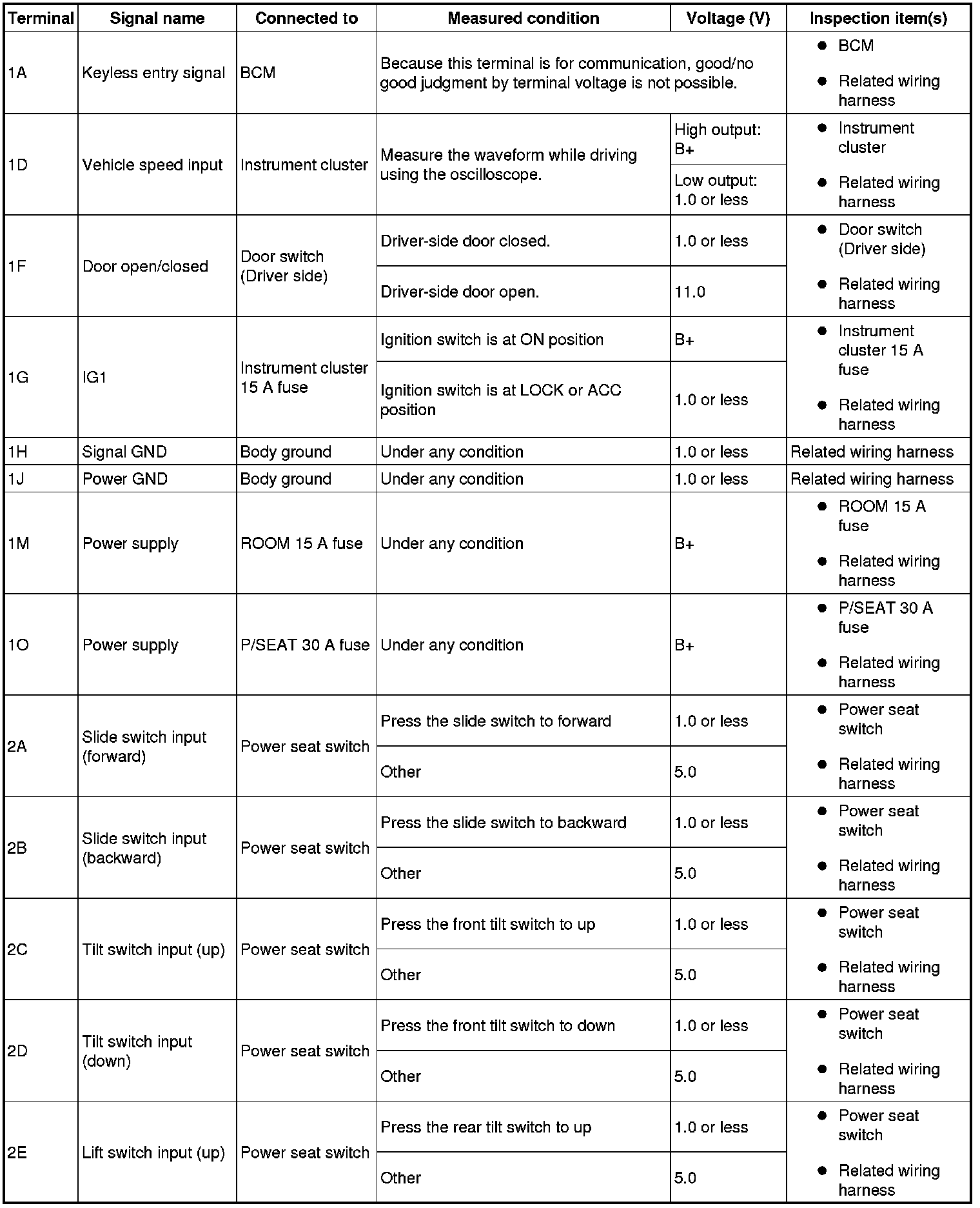 - If the voltage is not as specified in the Terminal Voltage Table (Reference), inspect the parts under "Inspection item(s)" and related wiring harnesses.