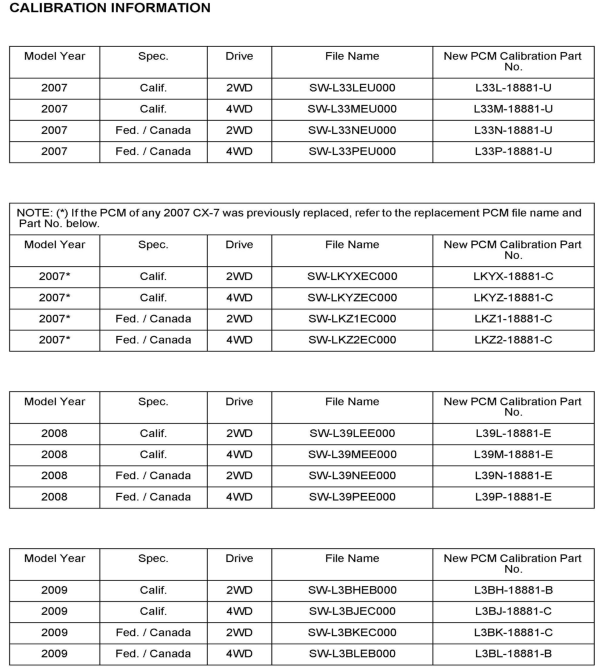 The new PCM Calibration Part Numbers listed above are provided for PCM reprogramming purposes only. These are not necessarily the same Mazda part numbers used to order an actual PCM through the Mazda Parts System. It is not necessary to order a PCM as part of this repair procedure.