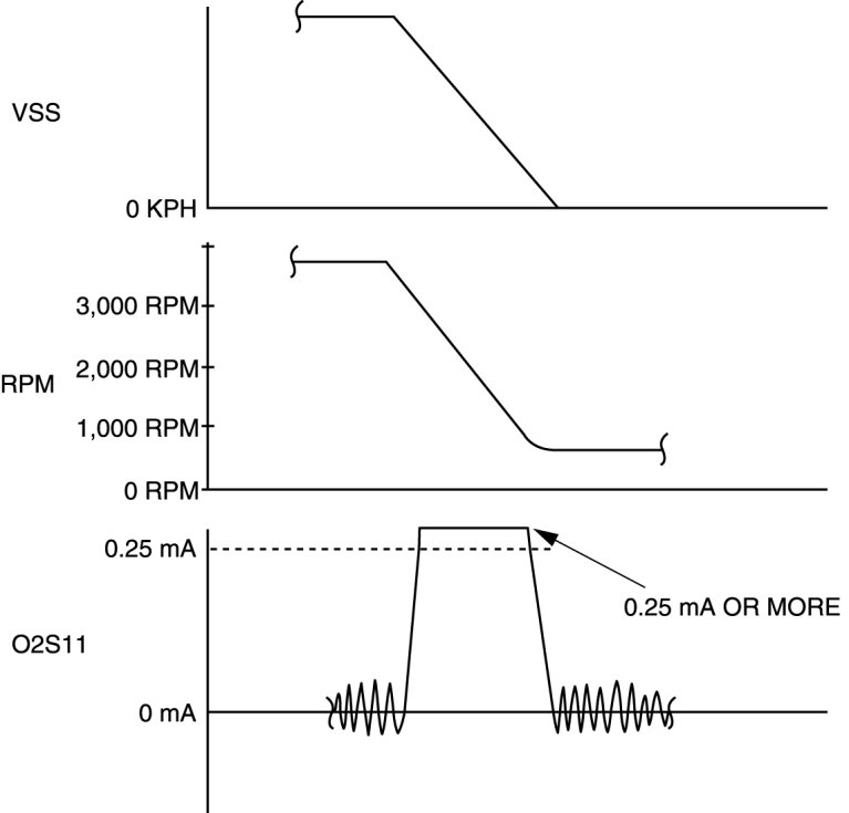 4. Verify that the A/F sensor current (PID: O2S11) is 0.25 mA or more while decelerating as shown in the figure.