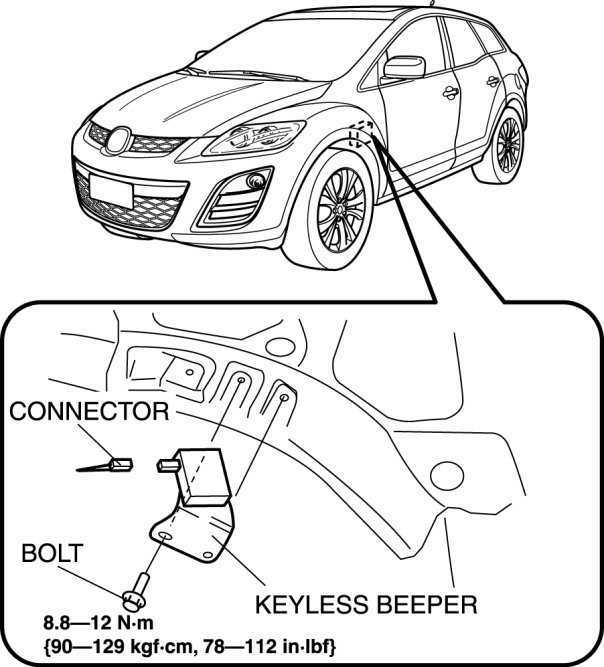 4. Disconnect the connector, then remove the keyless beeper.