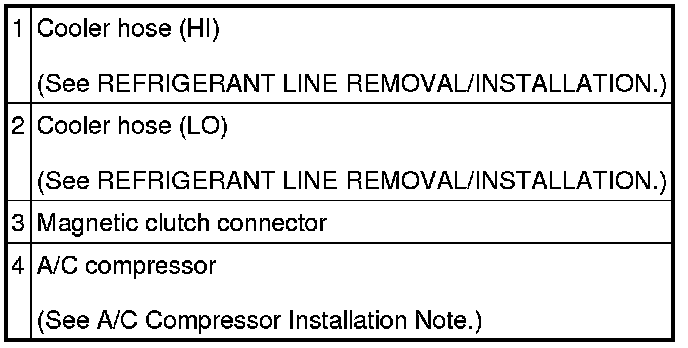 5. Remove in the order indicated in the table. Do not allow compressor oil to spill.