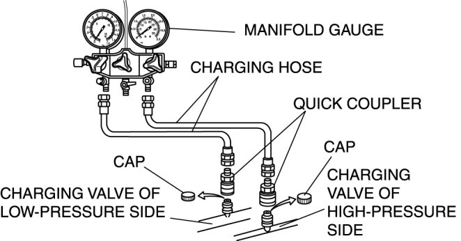 2. Connect the charging hoses to the high and low-pressure side joints of the manifold gauge.