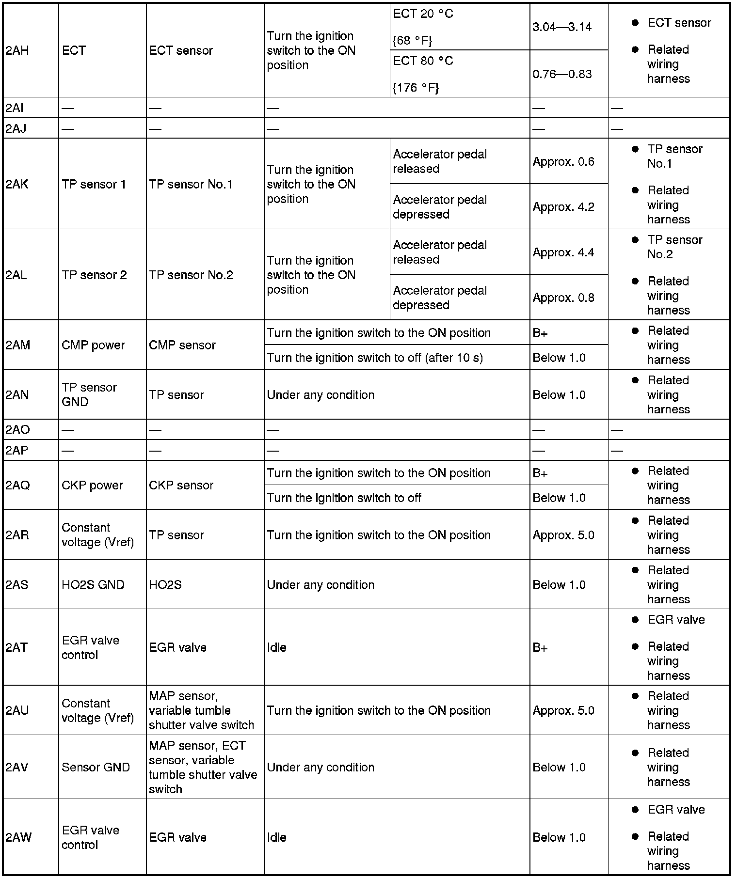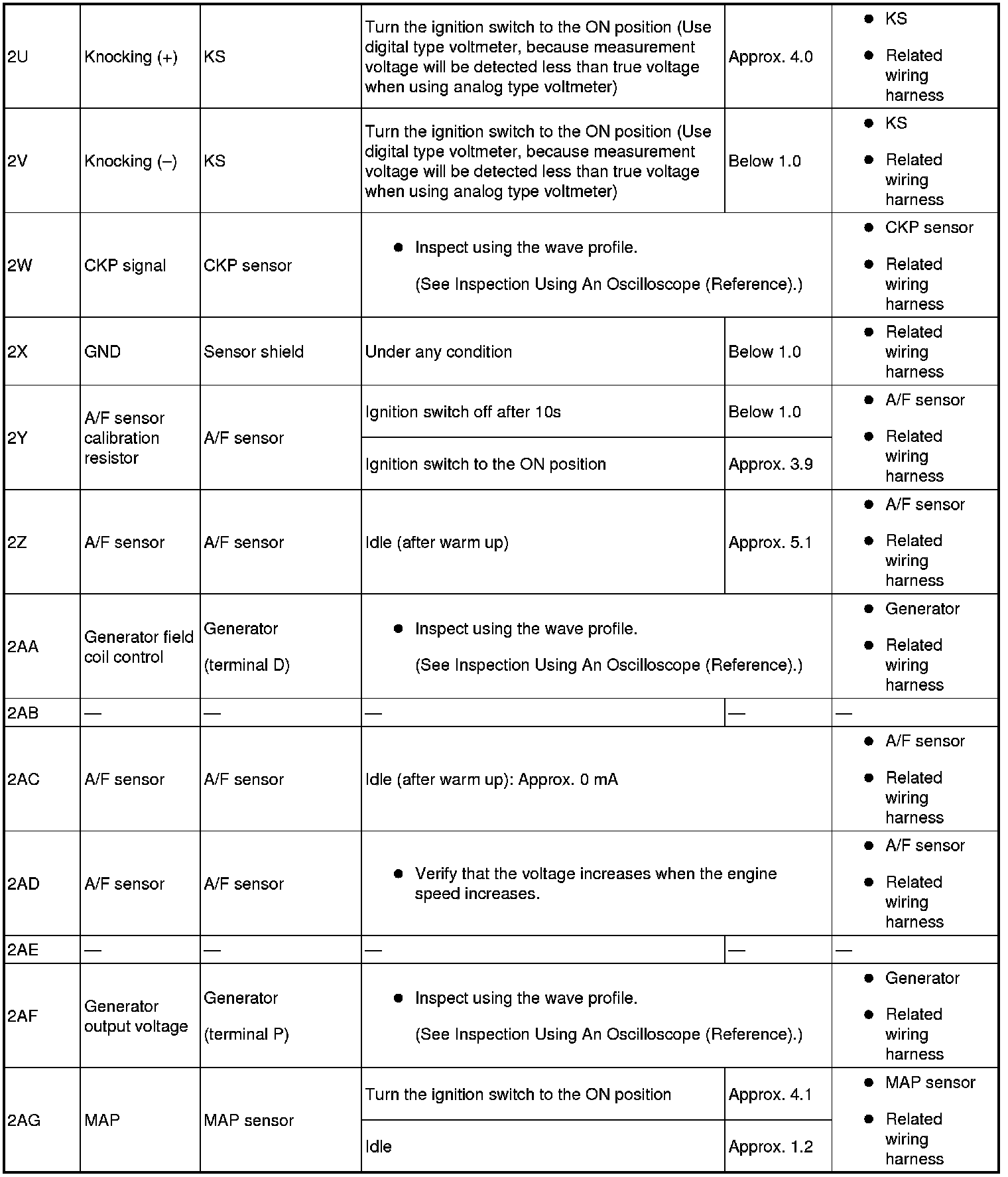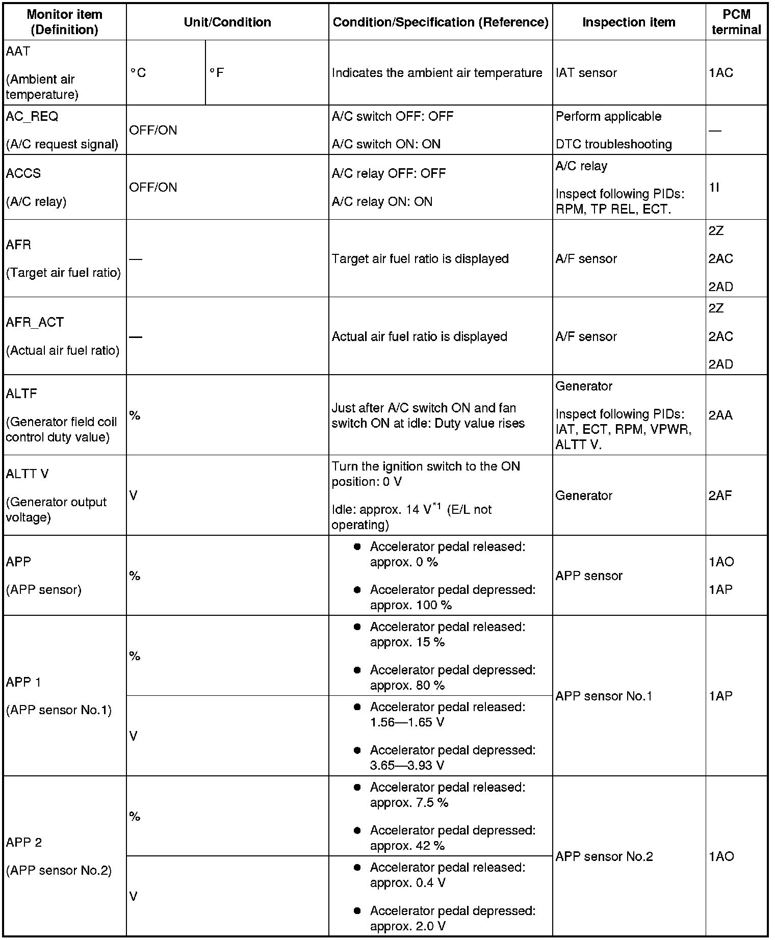 - The PCM terminal voltages vary with change in measuring conditions and vehicle conditions. Always carry out a total inspection of the input systems, output systems, and PCM to determine the cause of trouble. Otherwise, a wrong diagnosis will be made.