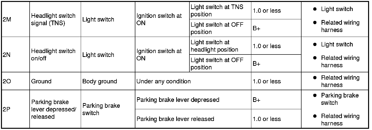 3. Measure the voltage at the auto light/wiper control module terminals as indicated below.