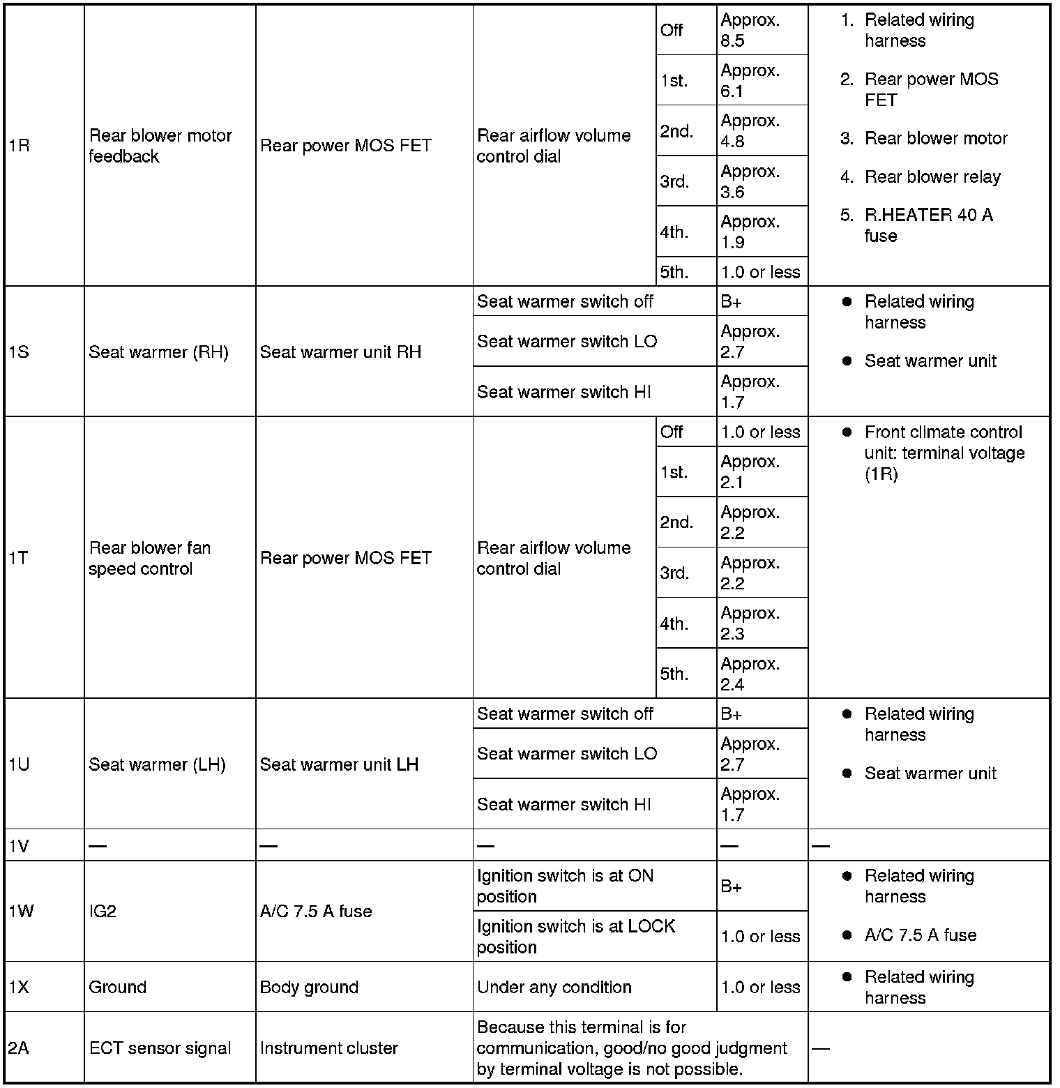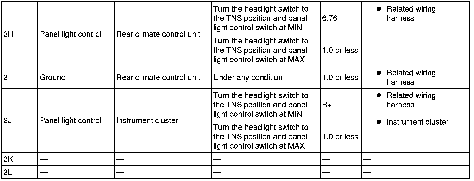 4. By inserting the positive (+) lead of the tester into each front climate control unit terminal, measure the voltage according to the terminal voltage table.