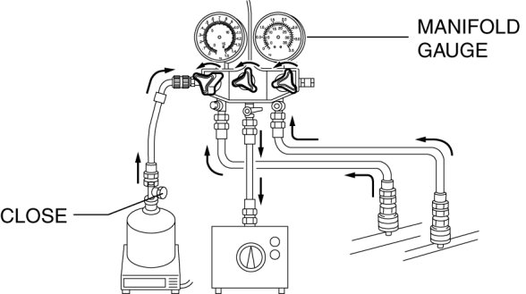 - Close the manifold gauge valve immediately after stopping the vacuum pump. If the valve is left open, the vacuum pump oil will flow back into the refrigeration cycle and cause a decrease in the efficiency of the air conditioner.