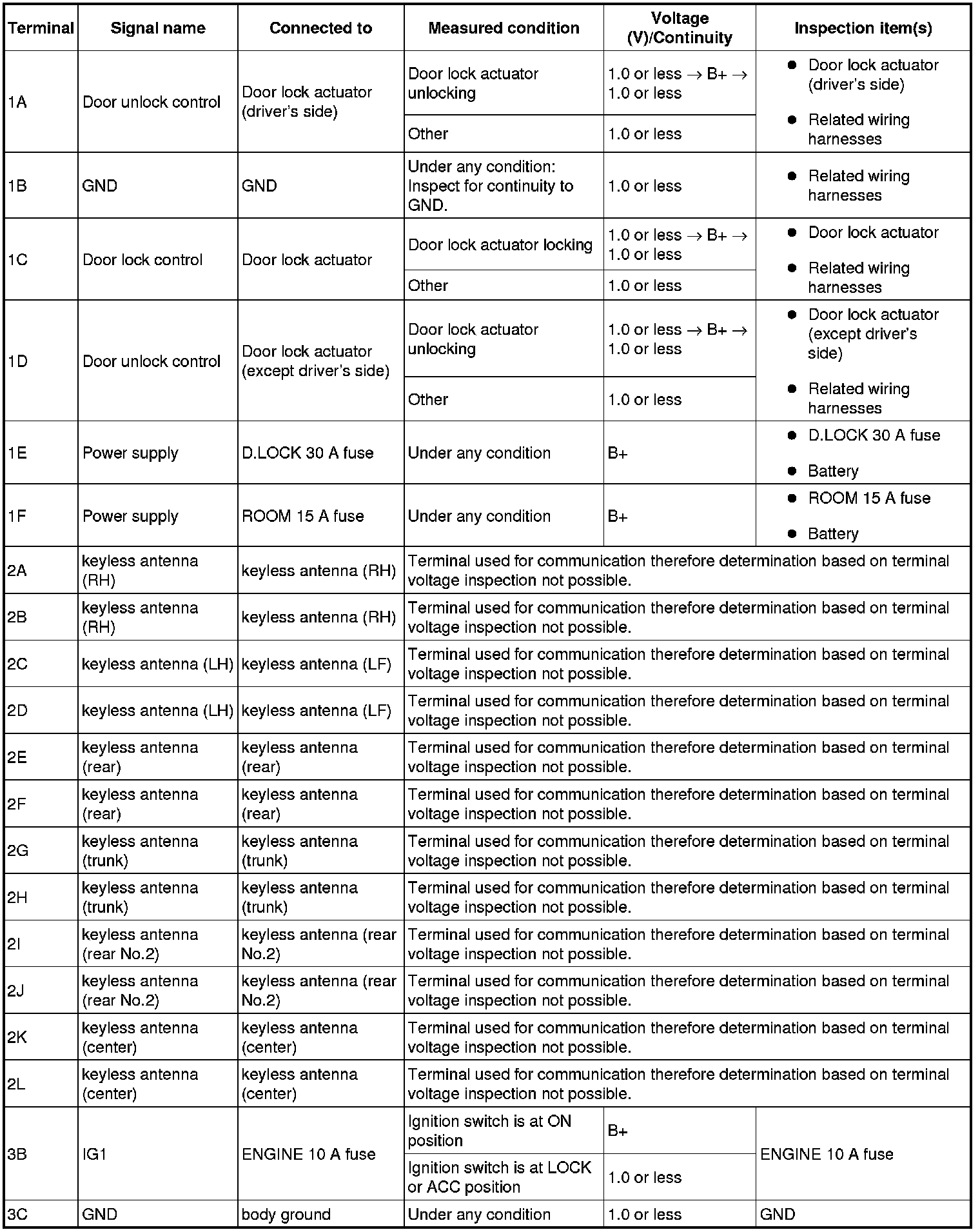 1. Measure the voltage or inspect for continuity according to the Terminal Voltage Table (Reference).