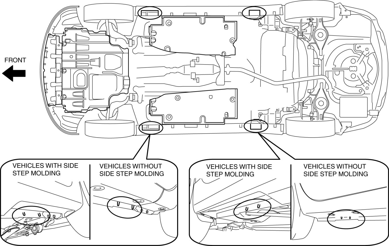 - Both sides of the vehicle, on side sills.
