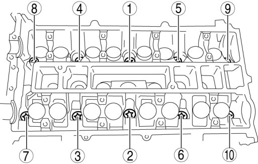 Tighten the camshaft cap bolts in two steps in the order shown in the figure.