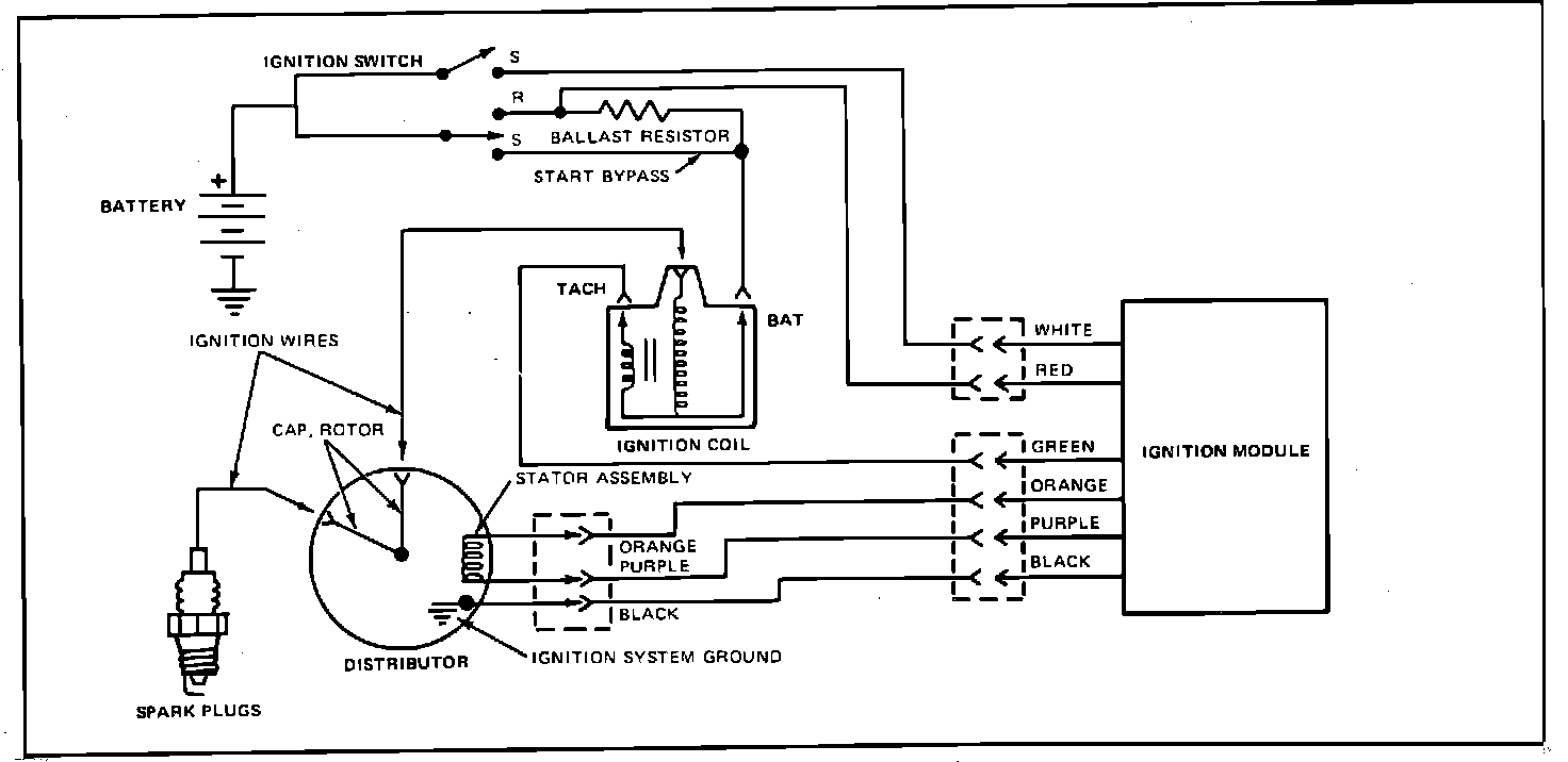 The Ignition Module shuts off the primary circuit each time it receives a pulse from the magnetic pick-up Fig. 9. A timing circuit in the ignition module turns the primary current back on after a short period of time. High voltage is created each time the magnetic field is built up and collapsed. The red ignition module wire provides operating voltage for the module's electronic components in the Run mode. The white module wire and start bypass provide increased voltage for the module and coil during Start mode.
