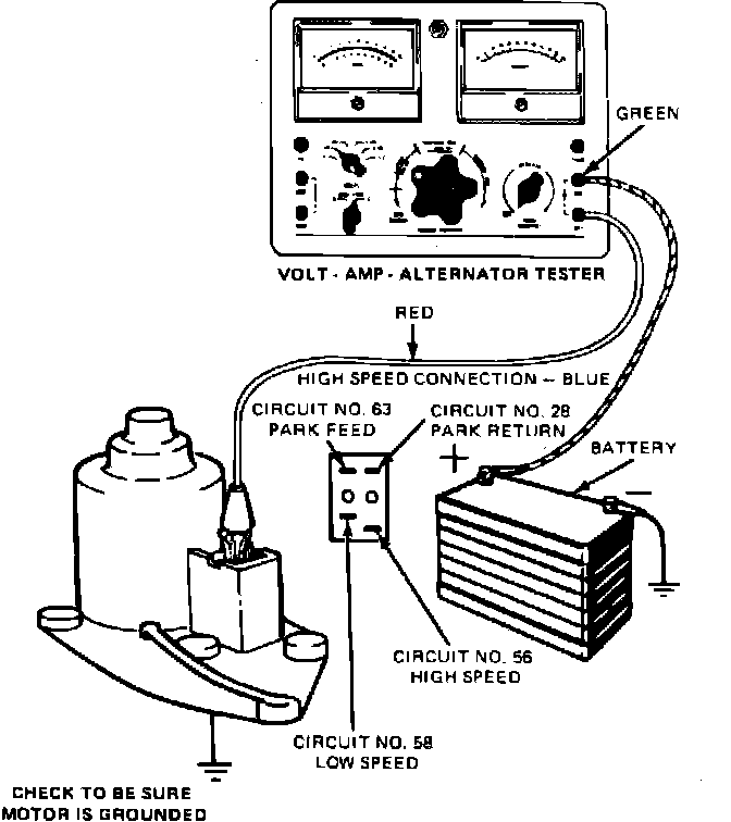 6. Place wiper switch in high position and connect test lamp between blue wire terminal at motor and ground.