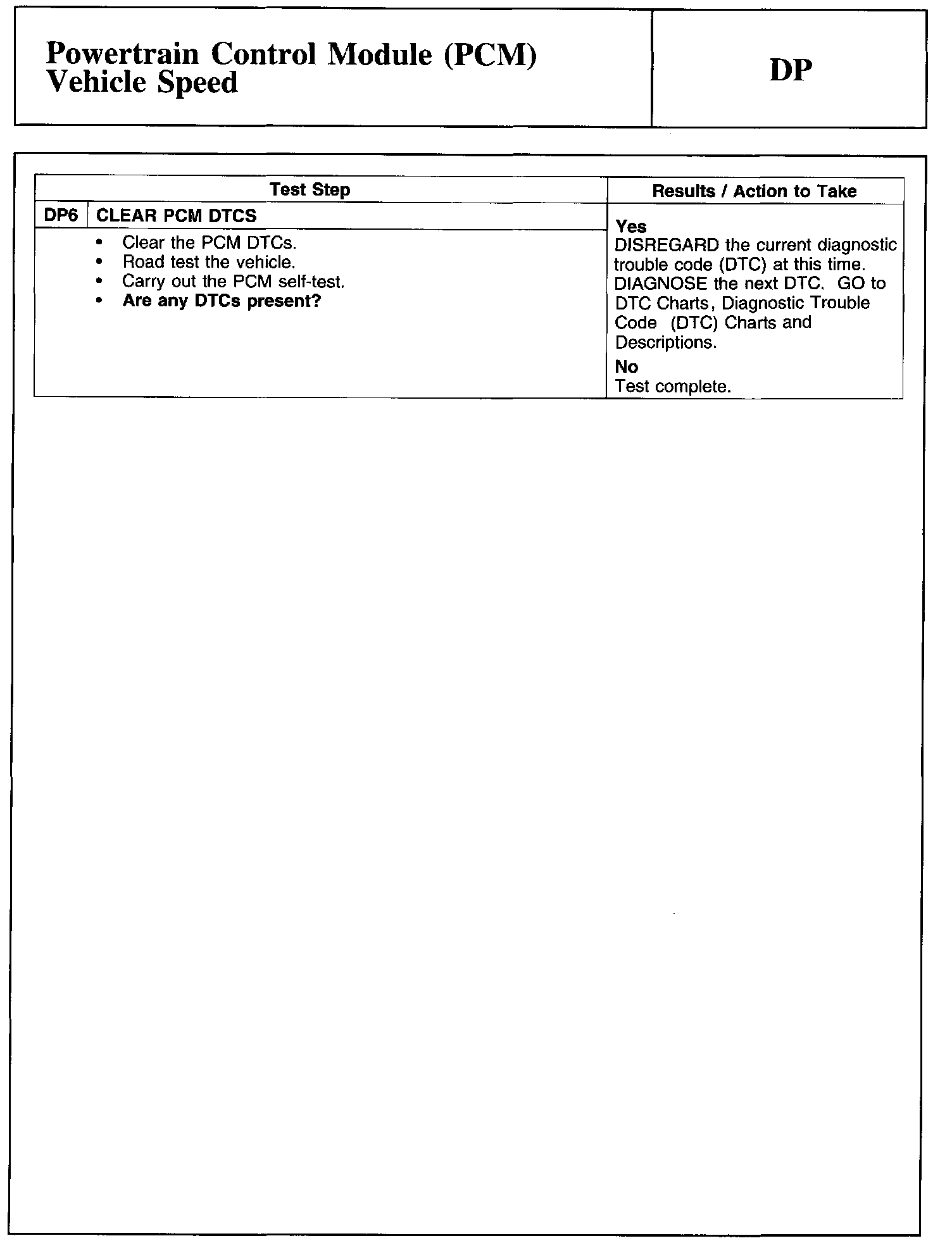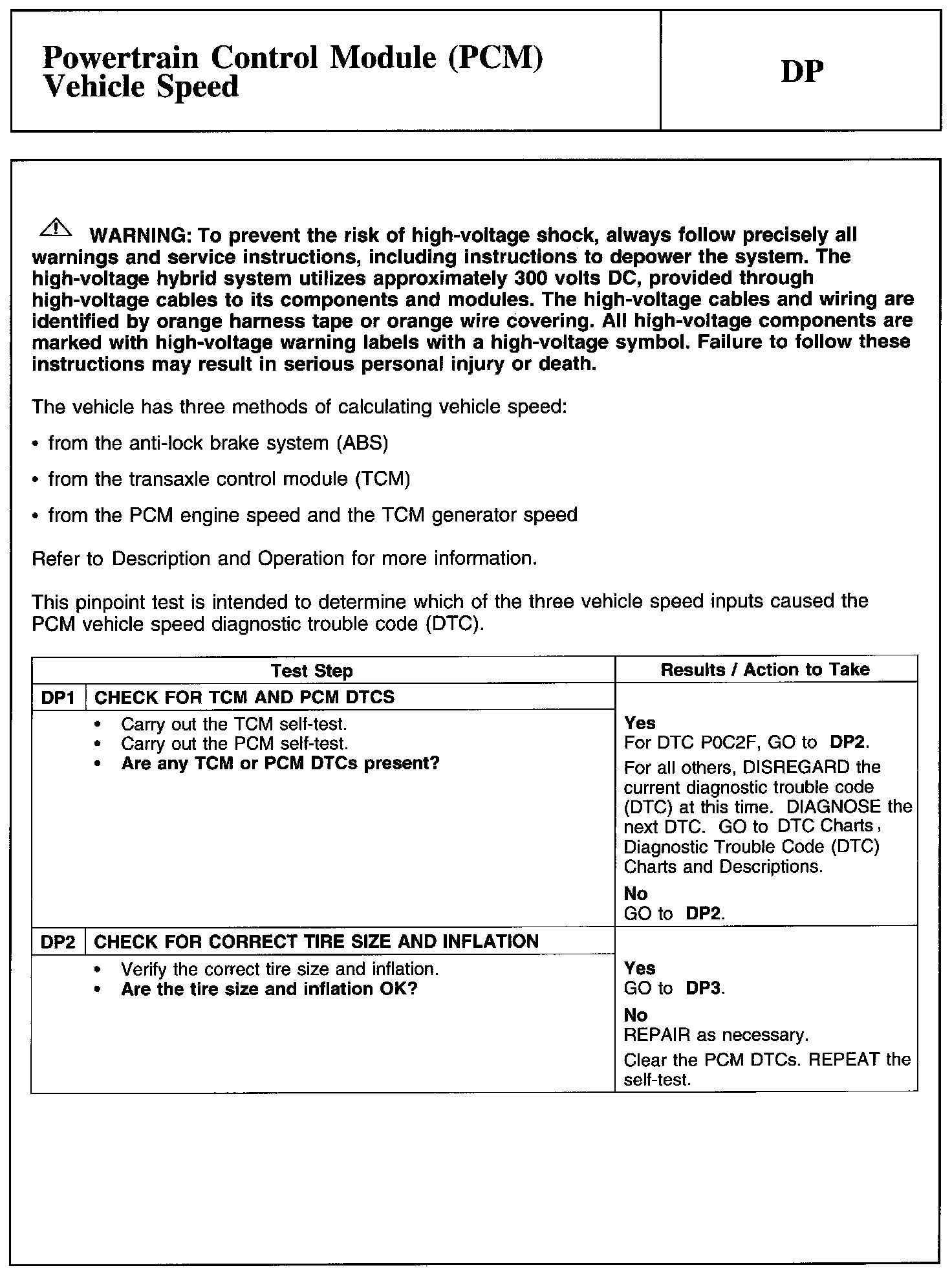 Test DP: Powertrain Control Module (PCM) Vehicle Speed