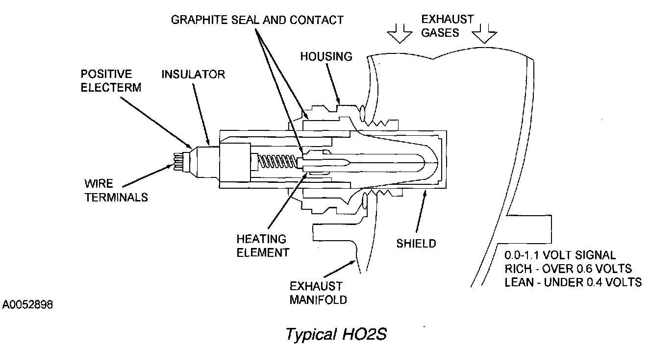 The HO2S detects the presence of oxygen in the exhaust and produces a variable voltage according to the amount of oxygen detected. A high concentration of oxygen (lean air/fuel ratio) in the exhaust produces a voltage signal less than 0.4 volt. A low concentration of oxygen (rich air/fuel ratio) produces a voltage signal greater than 0.6 volt. The HO2S provides feedback to the PCM indicating air/fuel ratio in order to achieve a near stoichiometric air/fuel ratio of 14.7:1 during closed loop engine operation. The HO2S generates a voltage between 0.0 and 1.1 volts.