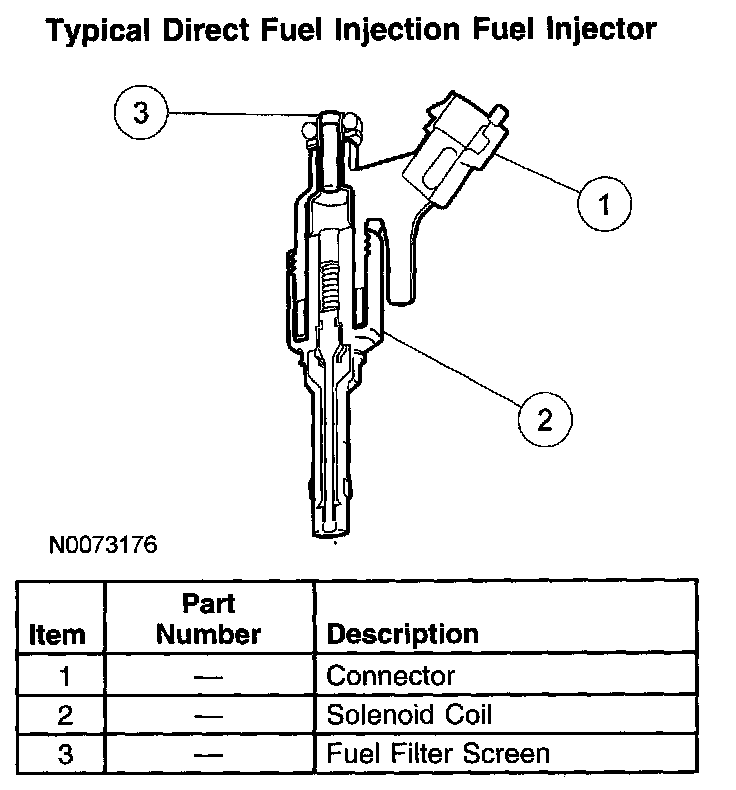 The gasoline direct fuel injection fuel injector delivers fuel directly into the cylinder under high pressure. Each injector is controlled by 2 circuits from the PCM.