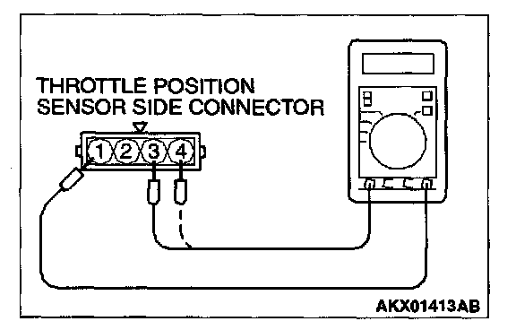 3. Measure resistance between the throttle position sensor side connector terminal 1 and terminal 3.