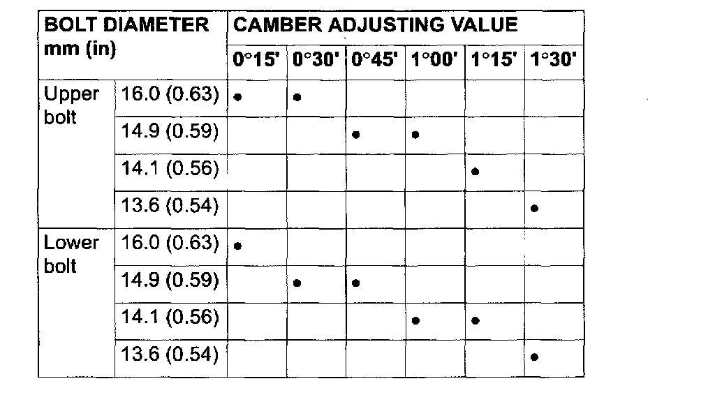 1. Estimate how much additional camber adjustment is required. Using the table, select the camber adjusting bolt, and then replace the knuckle and strut assembly connection bolts (upper bolt, lower bolt) with the selected bolts.