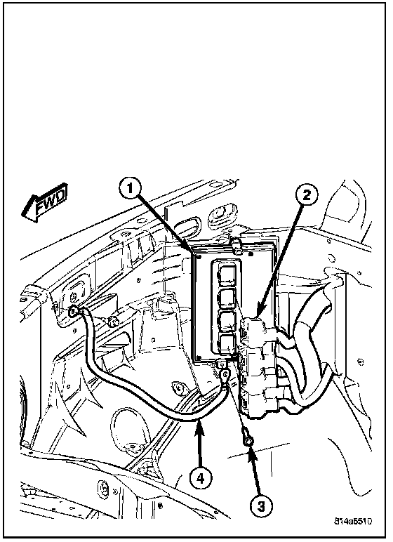 The PCM (1) is attached to the right-inner corner of the engine compartment.