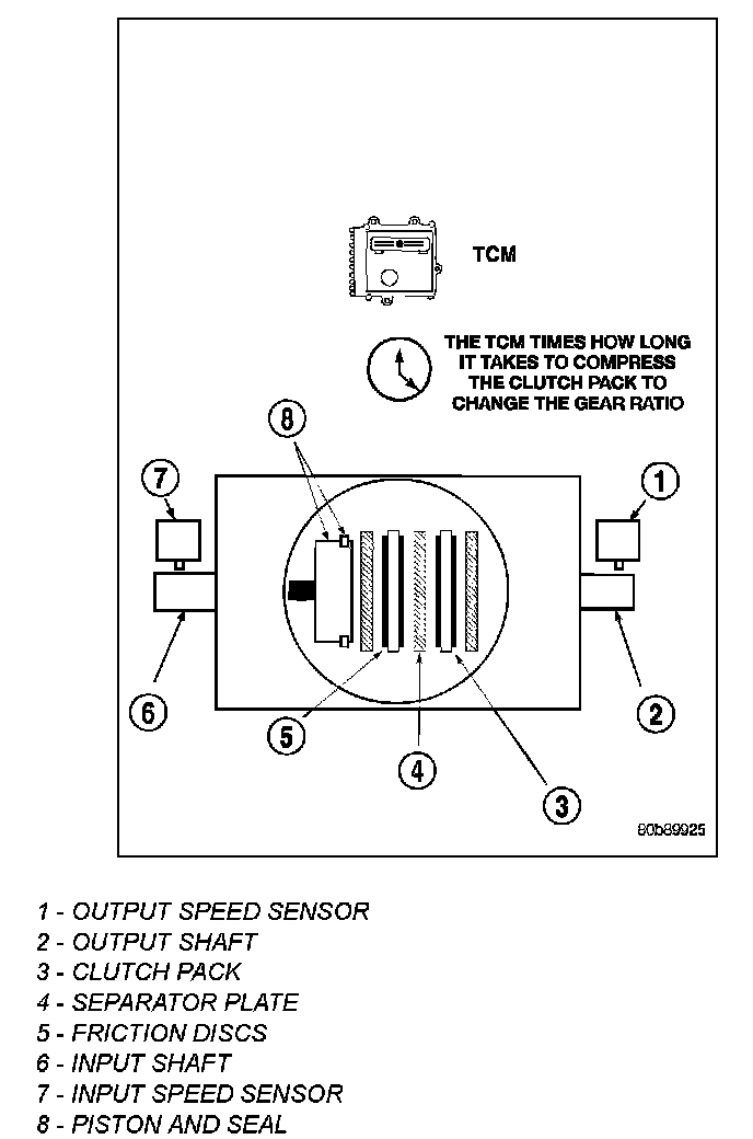 For example, if the input shaft is rotating at 1000 rpm and the output shaft is rotating at 500 rpm, then the TCM can determine that the gear ratio is 2:1. In direct drive (3rd gear), the gear ratio changes to 1:1. The gear ratio changes as clutches are applied and released. By monitoring the length of time it takes for the gear ratio to change following a shift request, the TCM can determine the volume of fluid used to apply or release a friction element.