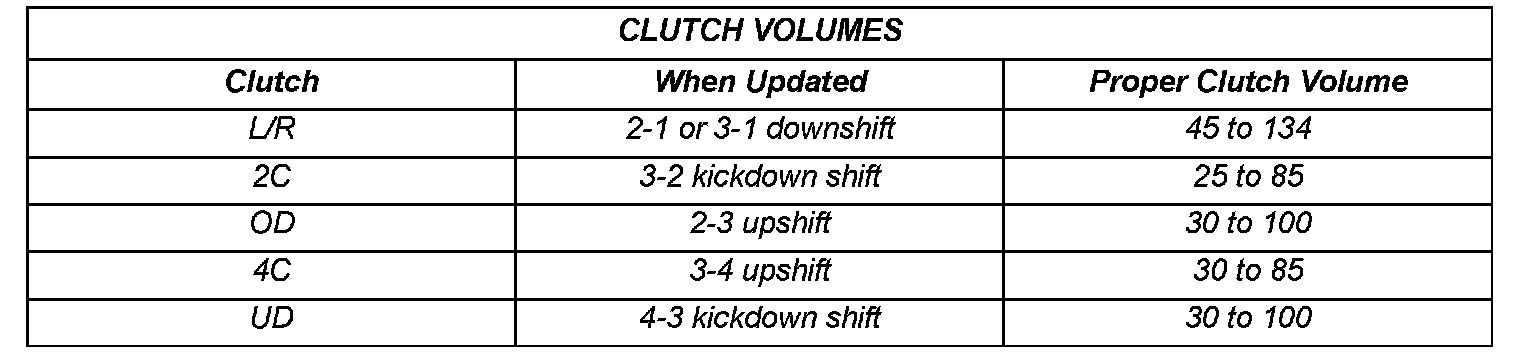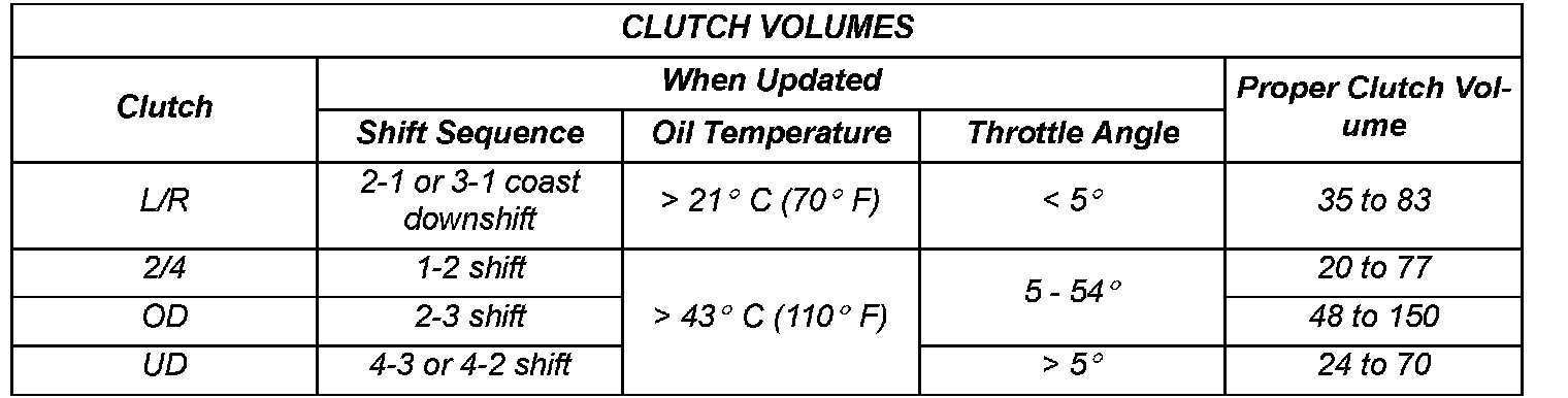 Certain mechanical problems within the input clutch assembly can cause inadequate or out-of-range element volumes. Also, defective Input/Output Speed Sensors and wiring can cause these conditions. The following charts identifies the appropriate clutch volumes and when they are monitored/updated: