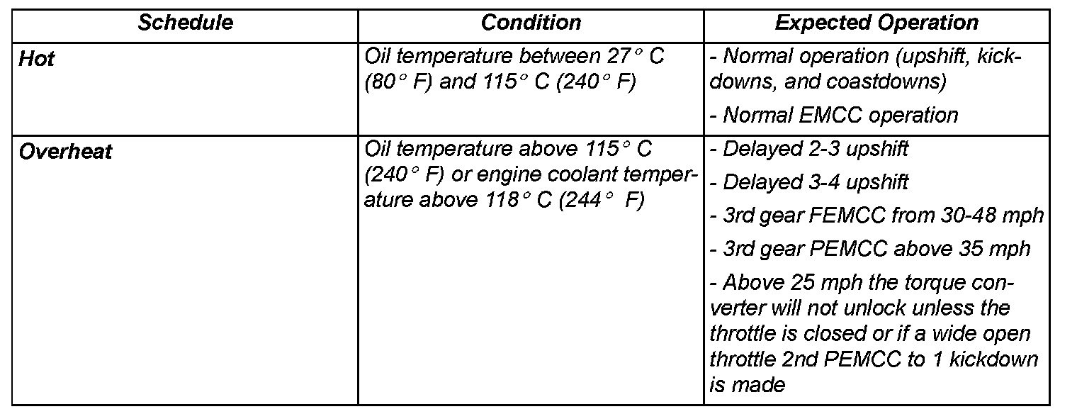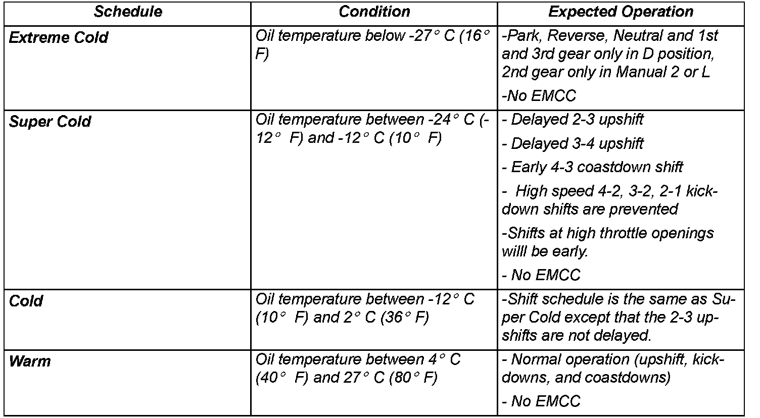 As driving conditions change, the TCM appropriately adjusts the shift schedule. Refer to the following chart to determine the appropriate operation expected, depending on driving conditions.