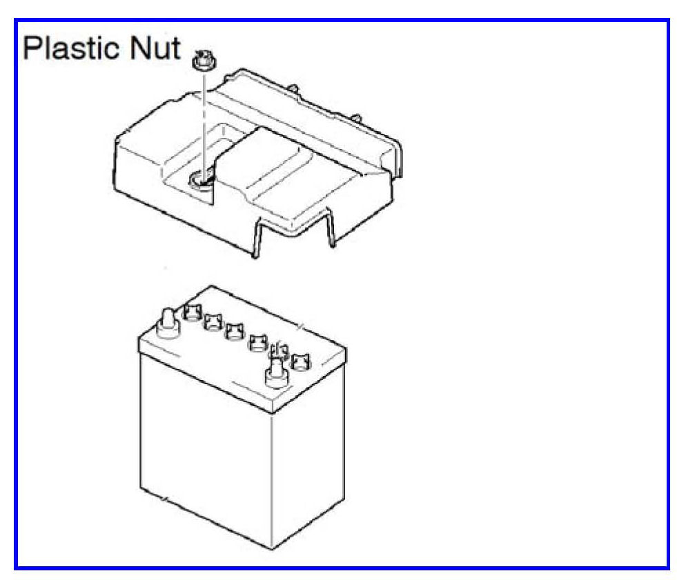 2. Remove the 12V auxiliary battery cover. Unscrew the plastic nut (pull up while turning).