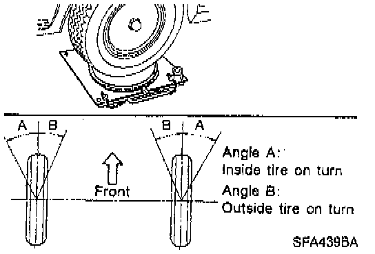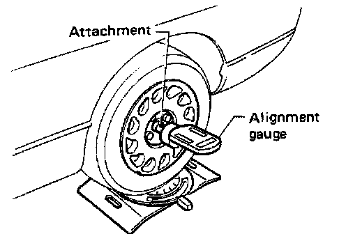 1. Set wheels in straight-ahead position. Then move vehicle forward until front wheels rest on turning radius gauge properly.