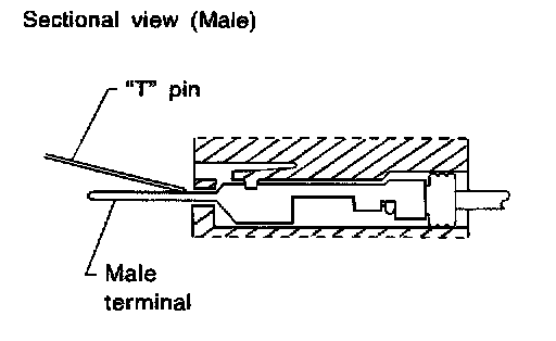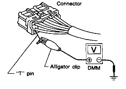 The probe of a digital multimeter (DMM) may not correctly fit the connector cavity. To correctly probe the connector, follow the procedures below using a "T" pin. For the best contact grasp the "T" pin using an alligator clip.