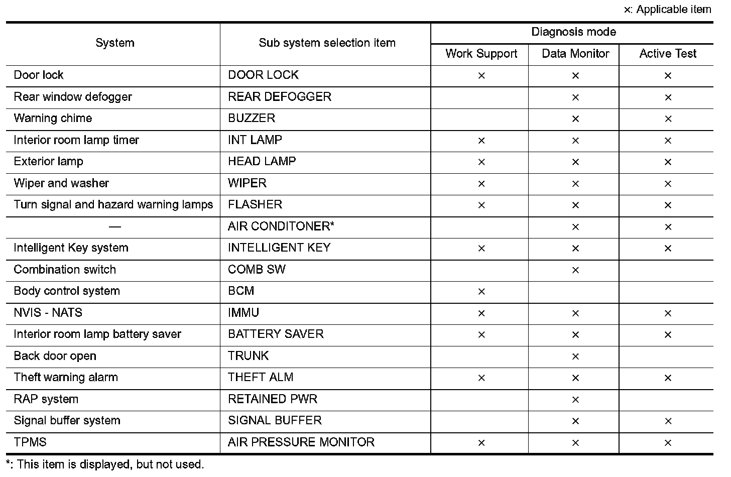 It can perform the diagnosis modes except the following for all sub system selection items.