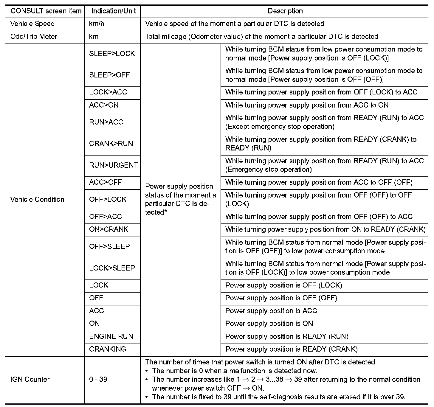 The BCM records the following vehicle condition at the time a particular DTC is detected, and displays on