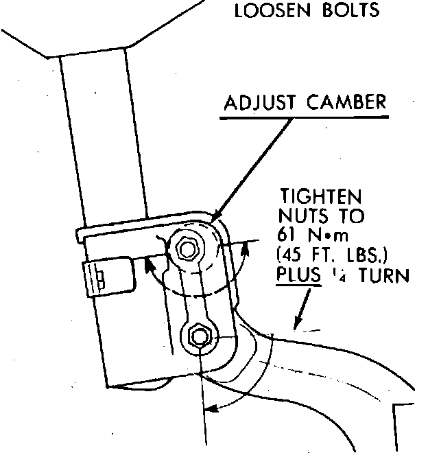 To adjust camber, loosen the cam and through bolts. Rotate the upper cam bolt to move the top of the wheel in or out to achieve the specified camber angle. Torque cam bolts to 45 ft. lbs., then advance bolts an additional 1/4 turn (90 degrees).