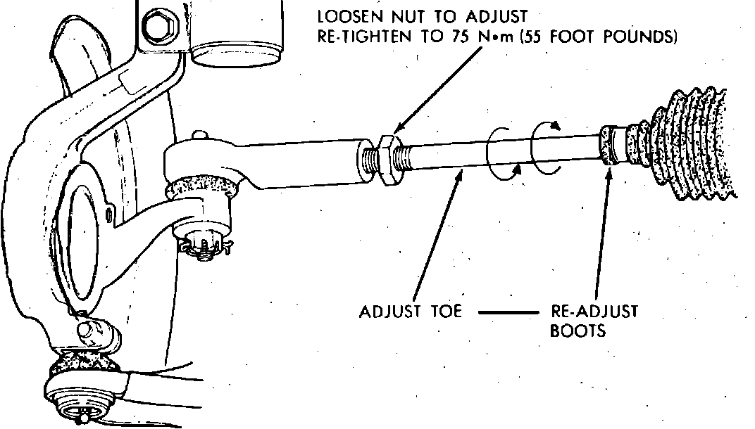 To adjust toe-in, center the steering wheel and hold in position with a suitable tool. Loosen the tie rod lock nuts and rotate the rod, to adjust toe-in to specifications. Use care not to twist the steering gear rubber boots. Torque the tie rod lock nuts to 55 ft. lbs. (75 Nm). Adjust position of steering gear rubber boots. Remove steering wheel holding tool.