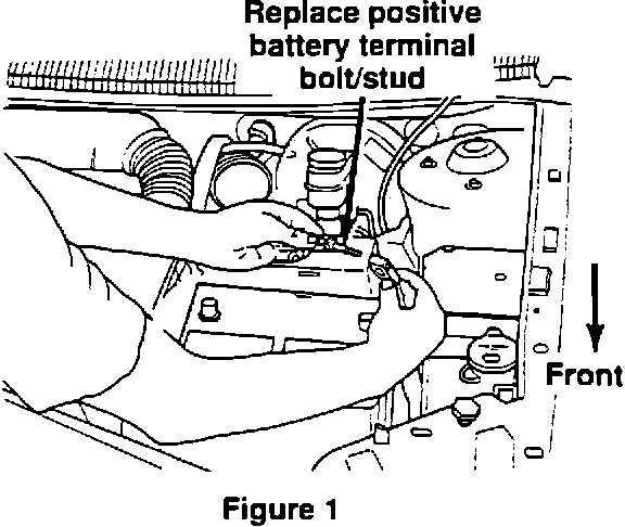 2. Disconnect the positive battery terminal, then remove and discard the bolt/stud assembly. Install the new positive battery terminal bolt/stud and torque starter cable eyelet nut to 105 +/- 15 lb-in. (Figure 1).