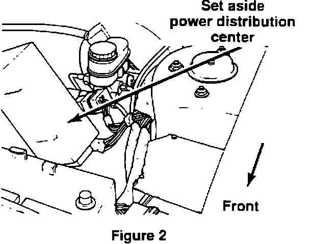 3. Depress two release tabs at front of Power Distribution Center (PDC) and set PDC aside for access to Powertrain Control Module (PCM) and wiring (Figure 2).