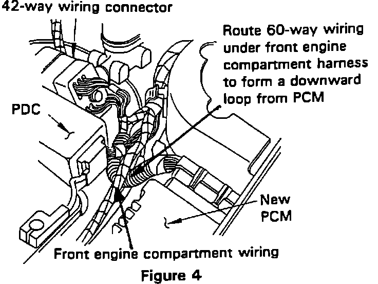 6. Route excess 60-way PCM wiring under the front engine compartment wiring harness so that the 60- way wiring forms a downward loop from the PCM (Figure 4).