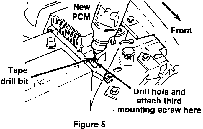 9. Center punch and drill an 1/8 inch hole in sheet metal at the forward PCM bracket hole location, then coat exposed metal with primer. Install one of the old (pointed) mounting screws in the drilled hole and tighten securely (Figure 5).