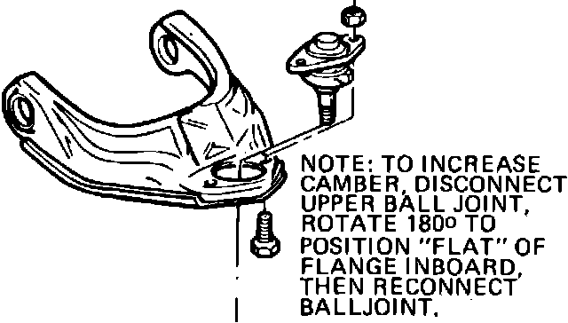 2. Camber may be increased approximately 1° by rotating 1/2 turn and reinstalling with flat of upper flange on inboard side of control arm, Fig. 1.