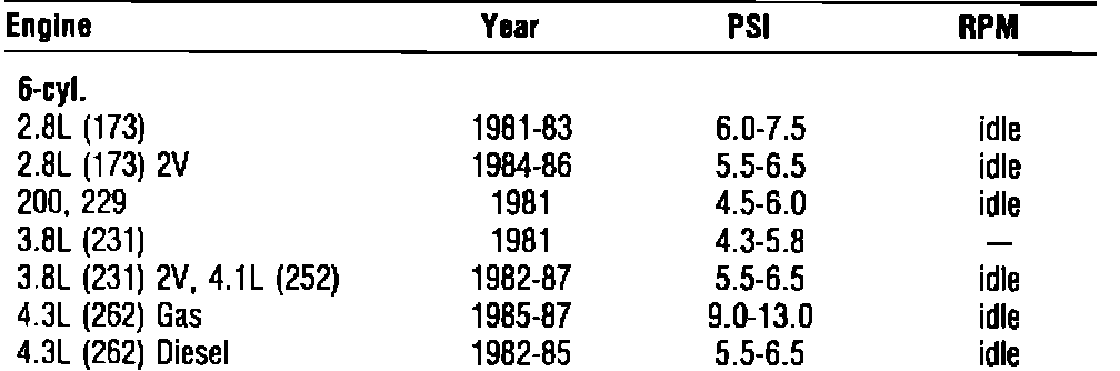 All models with TBI, pressure measured at fuel inlet of TBI unit.